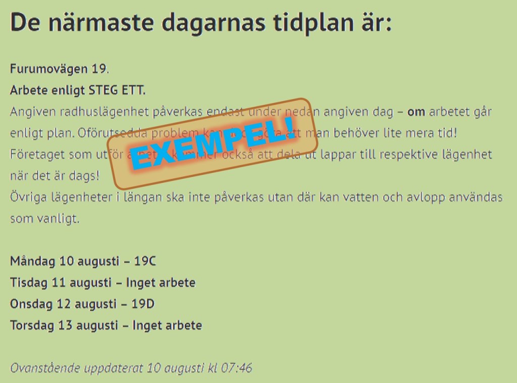 I slutet av varje vecka läggs den detaljerade tidplanen (se nedan) ut för den kommande veckan. Titta i den för att veta när arbetet planeras pågå med just DIN lägenhet och vidtag de listade åtgärderna! Längst ner kan du också se när informationen senast uppdaterades.